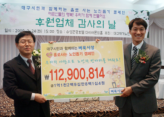대구벼룩시장은 2월 24일 대구재가노인복지협회 주최로 열린 ‘홀로사는 노인돕기 캠페인 후원업체 감사의 날' 행사를 통해 성금을 전달했으며, 협회측으로부터 감사패도 증정 받았다.