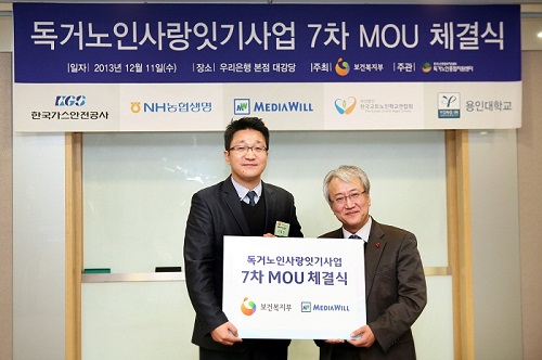 미디어윌 이동주 경영기획본부장은 11일 우리은행 본점에서 보건복지부 주최로 열린 ‘홀로 사는 어르신을 위한 사랑 나눔의 場’ 행사에 참여해 보건복지부 인구정책실 이태한 실장과 ‘독거노인 사랑잇기 사업 MOU’ 체결식을 가졌다